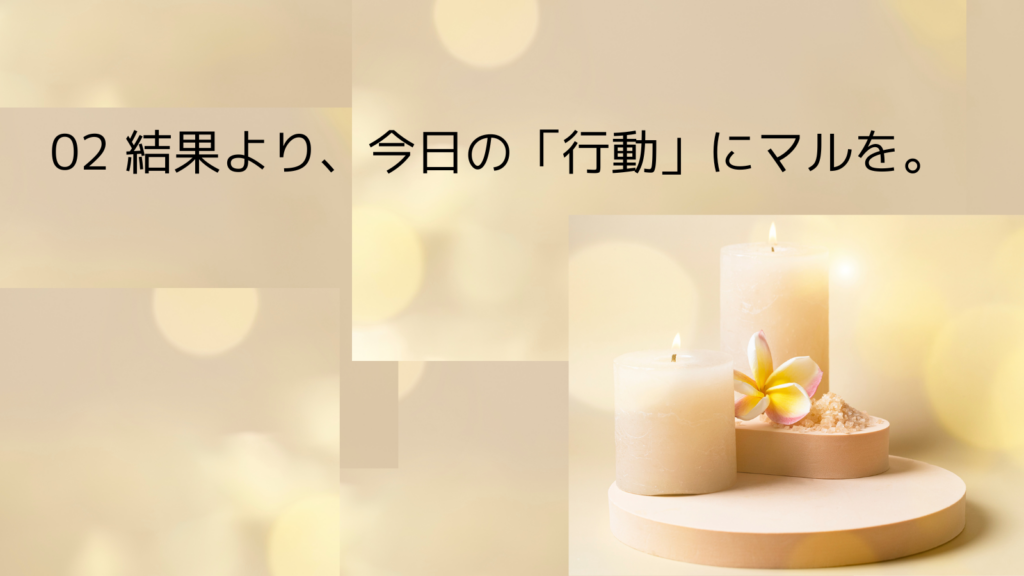 「今日もたいしたことができなかった」 「あんなに頑張ろうと思ったのに、結局ダメだった……」 一日の終わりに、布団の中でそんな反省会を始めてしまうことはありませんか? 特に新しいことに挑戦している時期は、つい「理想のゴール」と「今の自分」を比べ... -